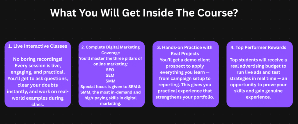 You’ll work on real digital marketing tasks, complete hands-on exercises, present mock client PPTs after major modules, and top performers will receive real ad budgets to run live campaigns.