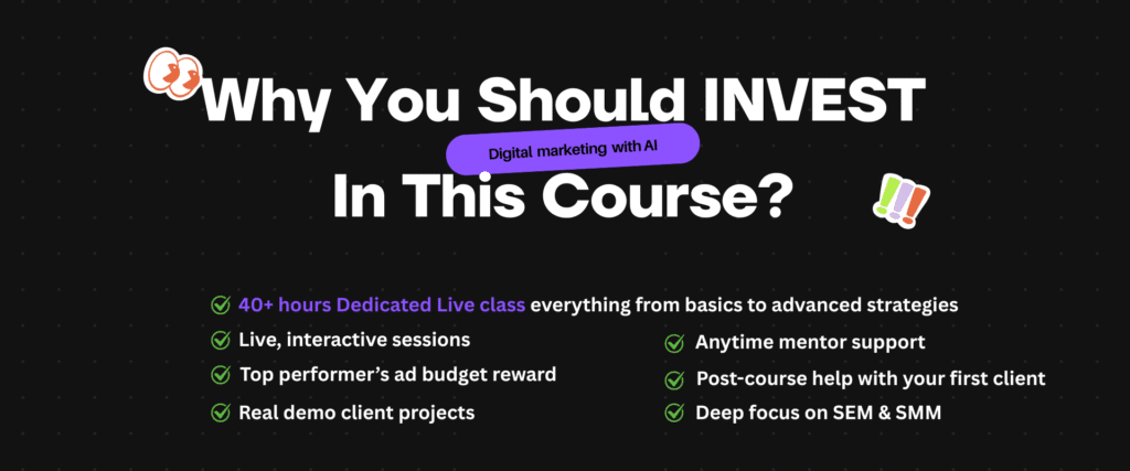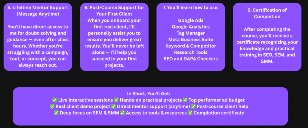 We offer 100% live classes, direct mentor access, mock client PPTs after major modules, and real ad budget opportunities for top-performing students.
